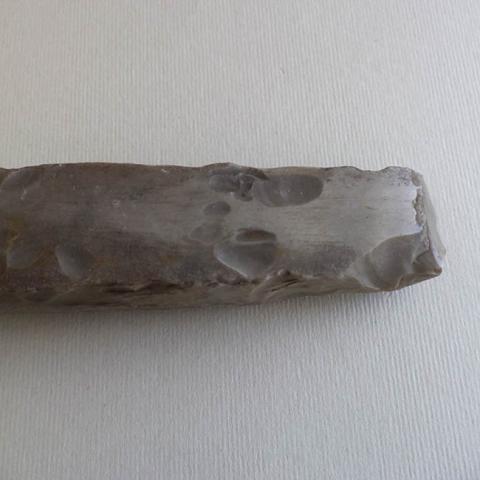 Herramienta de uso doméstico. Objeto de oblongo de sección cuadrada con el extremo proximal recto y el distal cortado a bisel para su uso funcional. Piedra de color gris oscuro tallada bifacialmente y pulida en superficie.