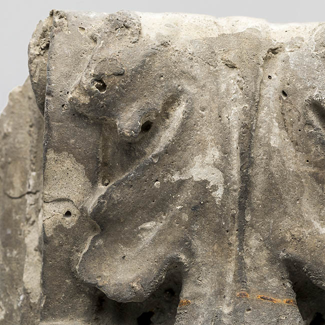 Ornamento estructural saledizo usado para adornar o sustentar un elemento volado por la parte inferior. Objeto conformado por una base cúbica y un adorno en relieve en la parte superior en forma vegetal estilizada de tipo hoja de acanto. Color gris claro con manchas oscuras.