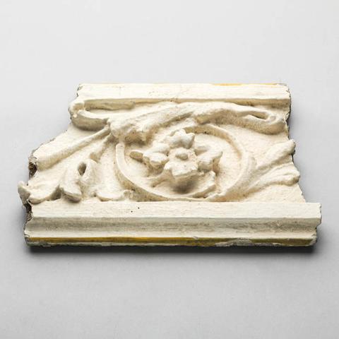 Ornamento usado como moldura decorativa en pared o fachada. Objeto oblongo de extremos irregulares con decoración fitomorfa y en volutas en la parte frontal. Color blanco.