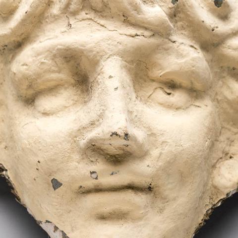 Ornamento con forma de rostro humano que se ubica en fuentes o en otras estructuras. Objeto de forma irregular que representa un rostro femenino en moldeado tridimensional.