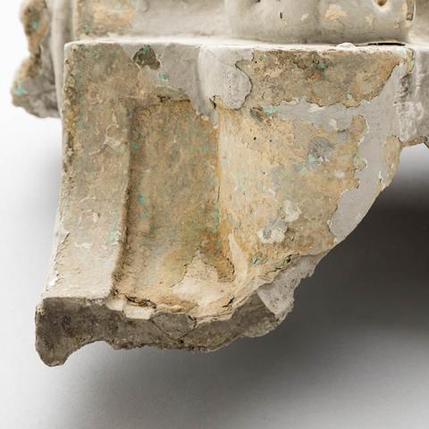 Ornamento usado para sostener alguna pieza escultórica o arquitectónica. Objeto de forma irregular con remate inferior en voluta y decoración fitomorfa en relieve en la cara superior.