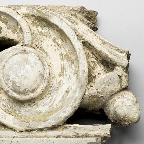 Ornamento con forma de rostro humano que se ubica en fuentes o en otras estructuras. Objeto de forma irregular que representa un rostro femenino modeado.