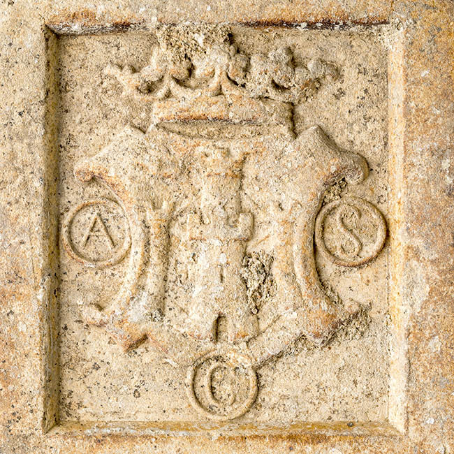 Elemento de terminación usado en pavimento de pisos. Objeto paralelepípedo con decoración en relieve en la cara superior, donde se observa el sello de fábrica en forma de escudo.