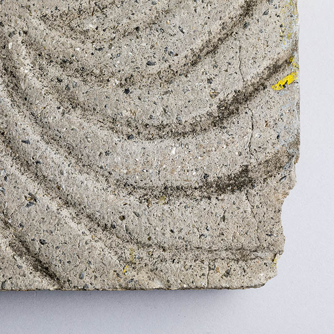 Elemento estructural usado en pavimento de pisos. Objeto paralelepípedo con decoración en relieve en la cara superior, donde se observa el sello de fábrica en forma de texto y una estrella central de cinco puntas.
