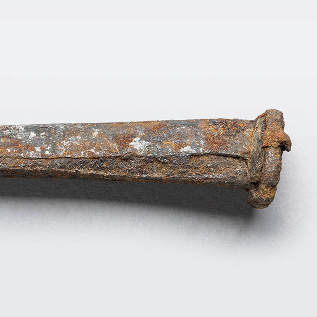 Implemento usado para fijar otros elementos estructurales. Objeto de forma trapezoidal alargada ligeramente más ancho en el sector proximal y apuntado en el extremo distal.Fabricado en fragua.