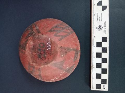 Contenedor abierto de perfil compuesto. Cuerpo cónico y base plana, con labio redondeado. Superficie alisada y engobada interior y exteriormente de color rojo con decoración interior en pintura negra con cuatro bandas de motivos de líneas onduladas verticales paralelas (tres bandas con cinco y una con cuatro líneas). Decoración exterior en pintura negra con una banda con motivo compuesto Ánimas (dos secciones enfrentadas, donde la segunda es la rotación en 180º de la primera, cada cual se compone de dos triángulos negros que se suceden en un eje vertical con su vértice mirando hacia adentro), el motivo está delimitado por una línea vertical en cada extremo. La pieza tiene otra banda con el mismo motivo, pero sin las líneas laterales verticales y dos motivos de franja con conjunto de tres líneas negras verticales paralelas, atravesadas por líneas oblicuas en sentido horizontal ascendente.