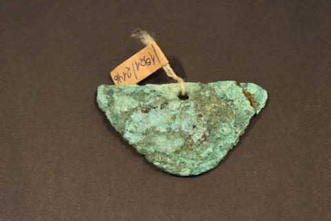 Adorno personal. Objeto elaborado en una lámina de cobre triangular de bordes curvos. Presenta un orificio en la base más extensa del triángulo. Superficie irregular. Color verde, amarillo y café rojizo.