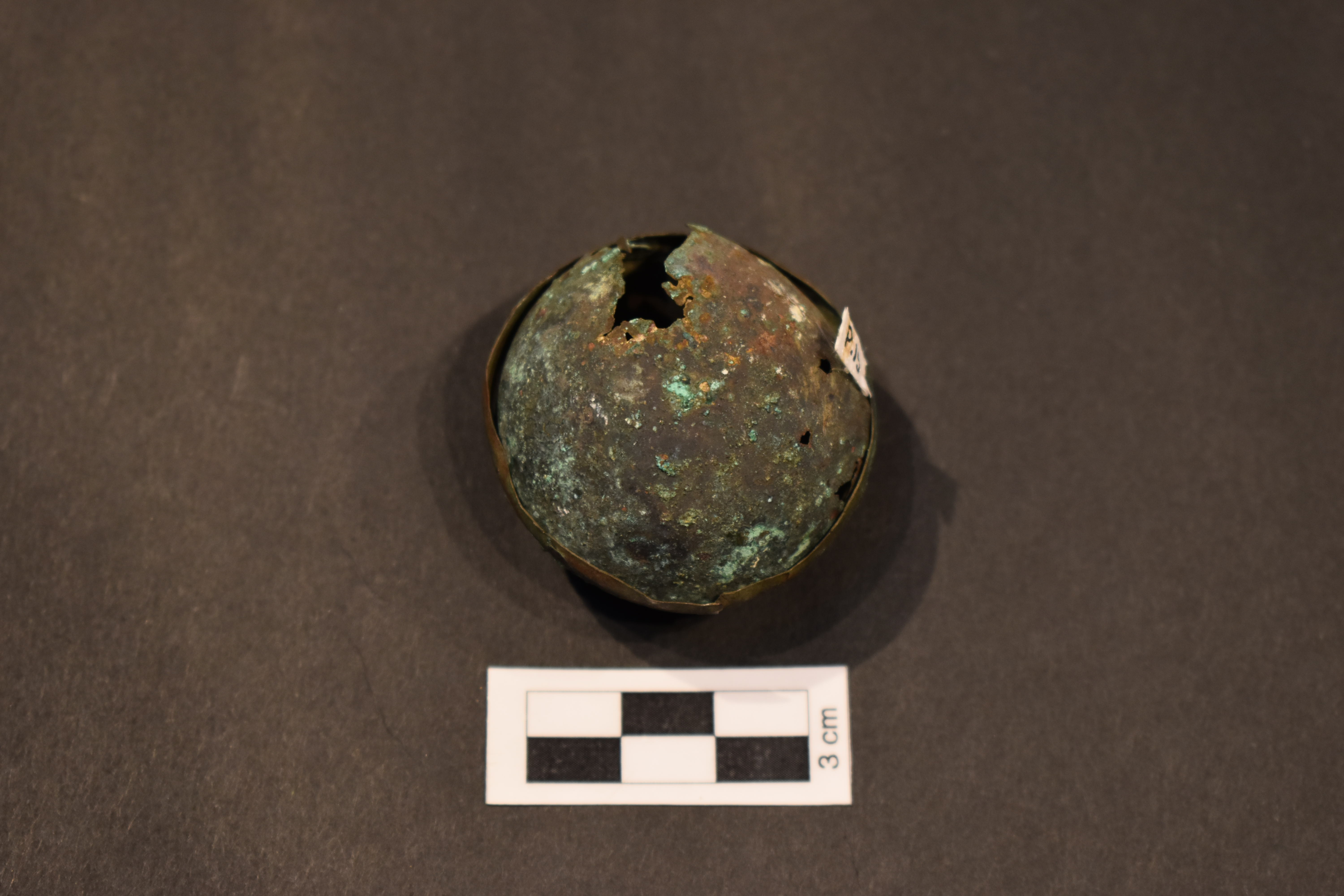 Objeto metálico con forma de bola hueca, confeccionada a partir de dos semiesferas de láminas de cobre unidas al centro, presenta cuatro orificios ubicados de forma paralela, dos a cada lado de la pieza. Una de las semiesferas está erosionada con faltantes de material. Color café rojizo con manchas verdes y turquesa.