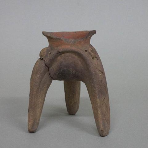 Contenedor abierto de perfil compuesto. Tiene labio redondeado, borde evertido, cuello cóncavo y cuerpo globular sostenido por tres pies de gran tamaño que se angostan hacia la base. Se encuentra decorado con modelados abstractos destacando el reborde en relieve en U invertida en la parte central de los pies, líneas en zigzag y punteado, así como la adición de tres modelados de aspecto antropomorfo estilizado. Superficie alisada y engobada de color anaranjado.