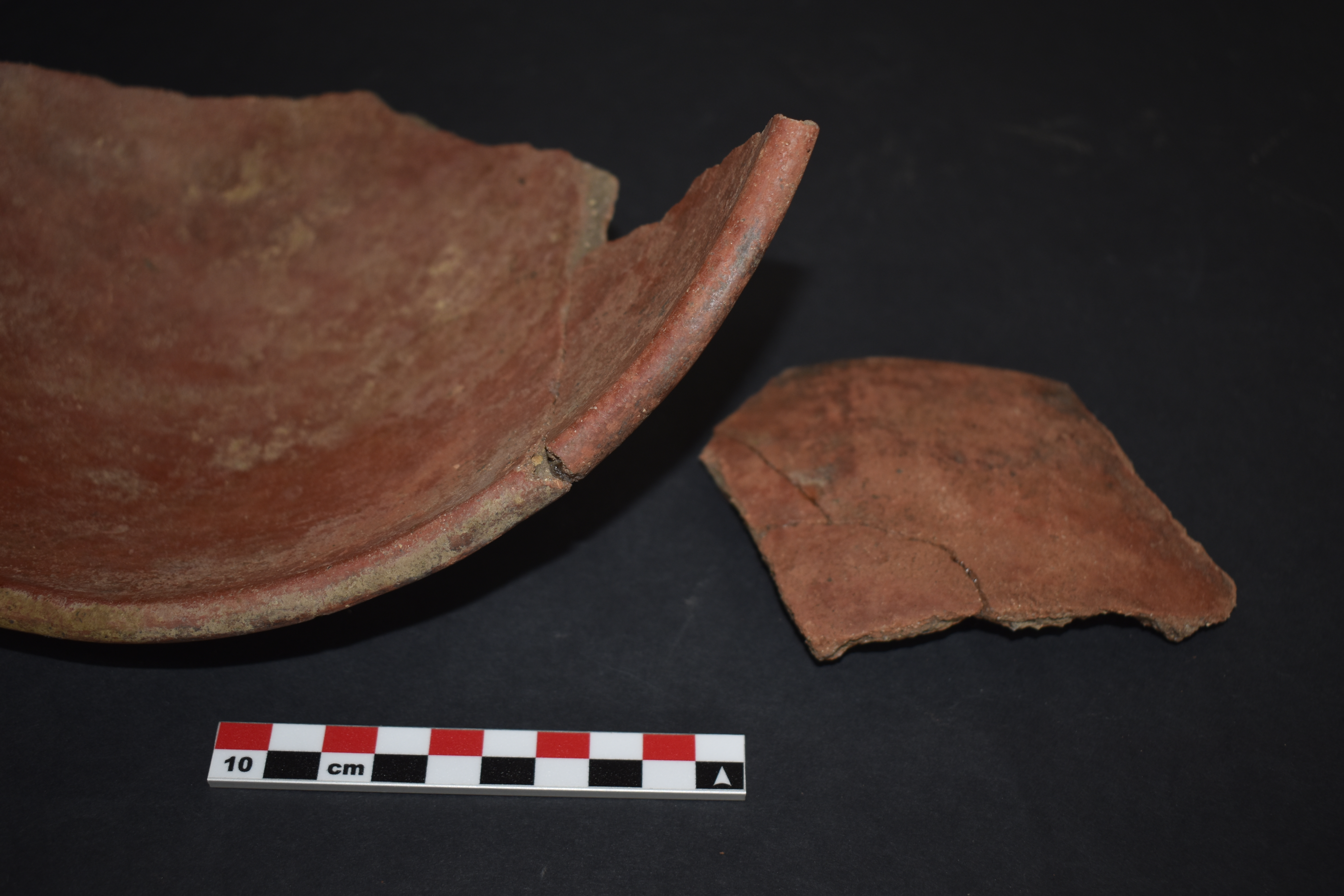 Contenedor abierto. Cuerpo hemisférico y base curva, con borde recto. Superficie interior y exterior pulida, rojo engobado