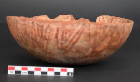 Contenedor abierto de perfil continuo. Cuerpo hemisférico y base curva, con borde redondeado. Superficie interior y exterior pulida. Decoración estrellada Aconcagua rojo sobre salmón, exterior con manchas de hollín