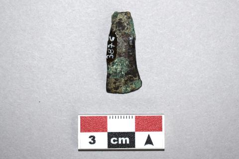 Instrumento metálico correspondiente a una placa rectangular metálica. Presenta un extremo más angosto que el otro. Pieza color verde debido a pátina.
