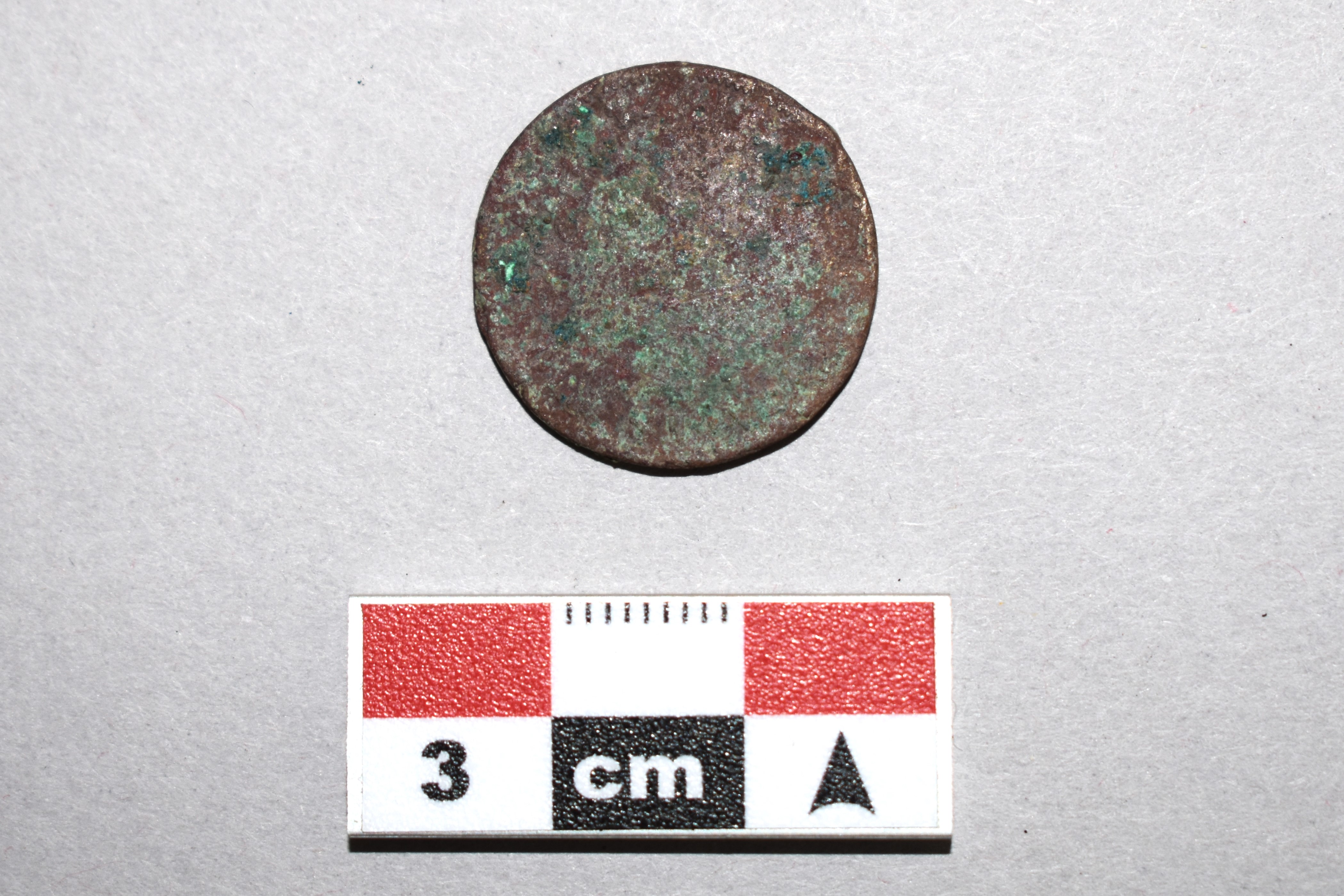 Objeto metálico acuñado. Cuerpo plano y circular. Pieza con grabado en ambas caras. Cara frontal presenta gravado "medio centavo 1872" ligeramente legible. Cara posterior presenta un rostro al centro.