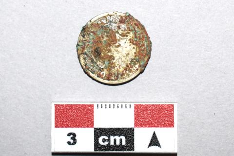 Objeto metálico acuñado de cuerpo plano y forma circular. Pieza con grabados a ambas caras. En cara frontal presenta figura irreconocible. En cara posterior presenta como centro una figura de condor y la inscripción "República de Chile 1881"