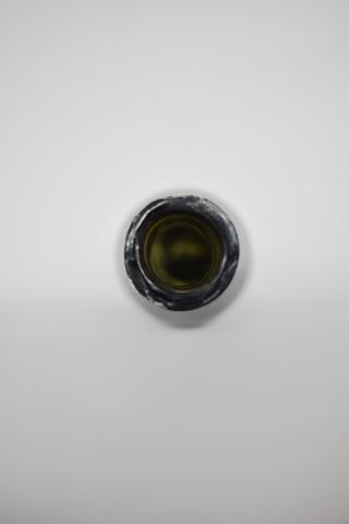 Recipiente de vidrio. Contenedor de líquidos de forma compuesta con base plana. Su cuerpo es cónico de perfil liso con hombros marcados y cuello largo que culmina en un gollete corto ligado a la boca, la cual es circular de labio plano y perfil recto. Pieza color verde oscuro.