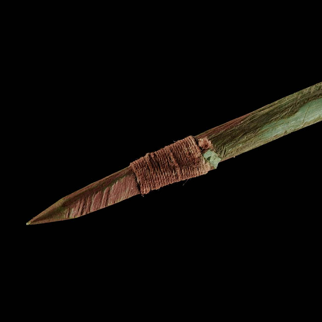 Objeto de forma alargada, con cuerpo cilíndrico regular, posee el sector distal tallado de maner aguzada en el cual se encuentra anudado un fragmento del vástago. De color marrón claro y verde claro, manchas rojas.
