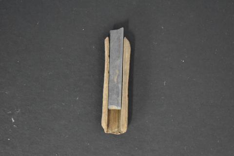 Objeto que se usa para escribir o dibujar. Presume forma cilíndrica, pero corresponde a una pieza de un lado plano y otro ligeramente curvo. En el lado plano presenta la mina de grafito en el lado curvo presenta la cobertura de madera. Corresponde a un fragmento de lápiz gráfito.