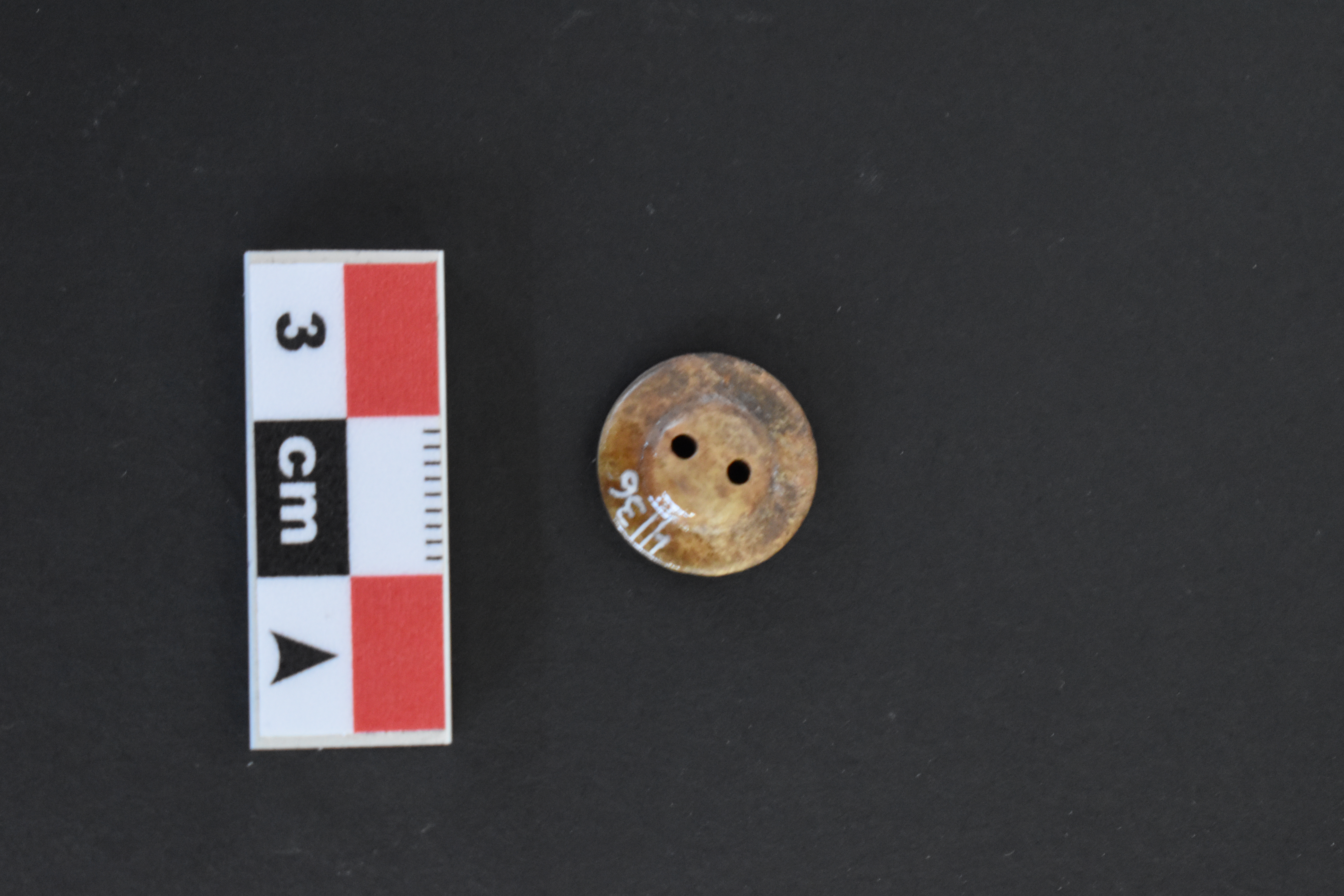 Objeto de vestir. Prenda decorativa y funcional parte de un atuendo. Corresponde a una pieza discoidal plana con concavidad central que es una cupula en cara posterior. En la concavidad presenta dos agujeros en el centro posicionados simétricamente. Pieza color café.