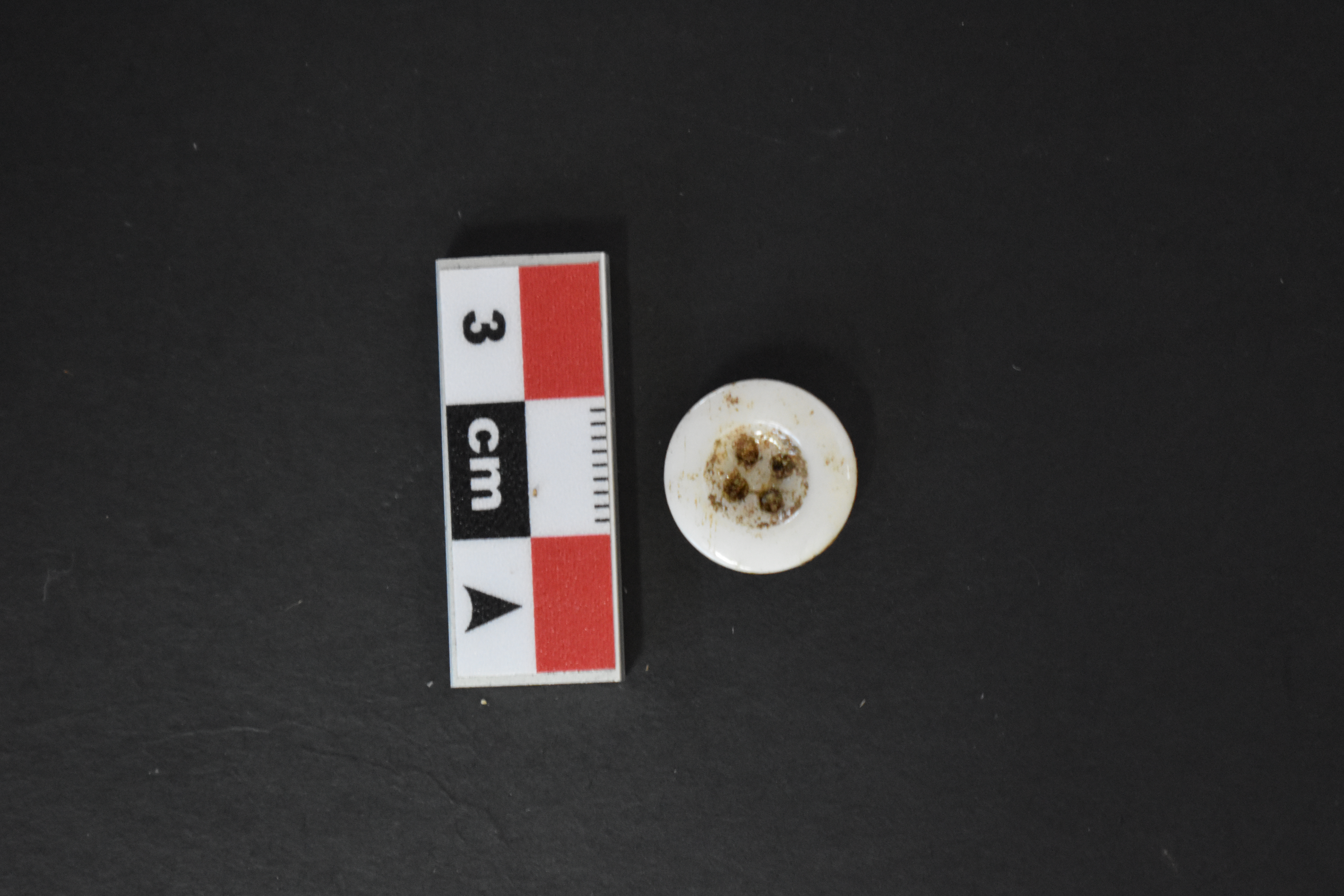 Objeto de vestir. Prenda decorativa y funcional parte de un atuendo. Corresponde a una pieza discoidal plana con concavidad central donde presenta cuatro agujeros en el centro posicionados simétricamente. Pieza color blanco. Presenta arenisca negra adherida.