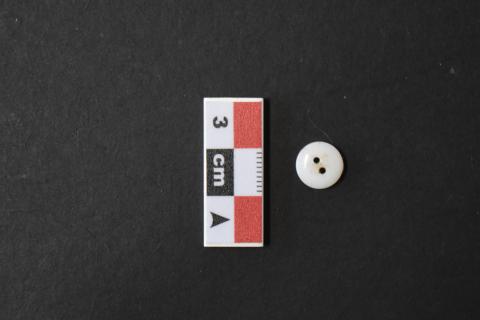 Objeto de vestir. Prenda decorativa y funcional parte de un atuendo. Corresponde a una pieza discoidal plana con dos agujeros posicionados simétricamente en el centro de la pieza. Objeto color blanco.