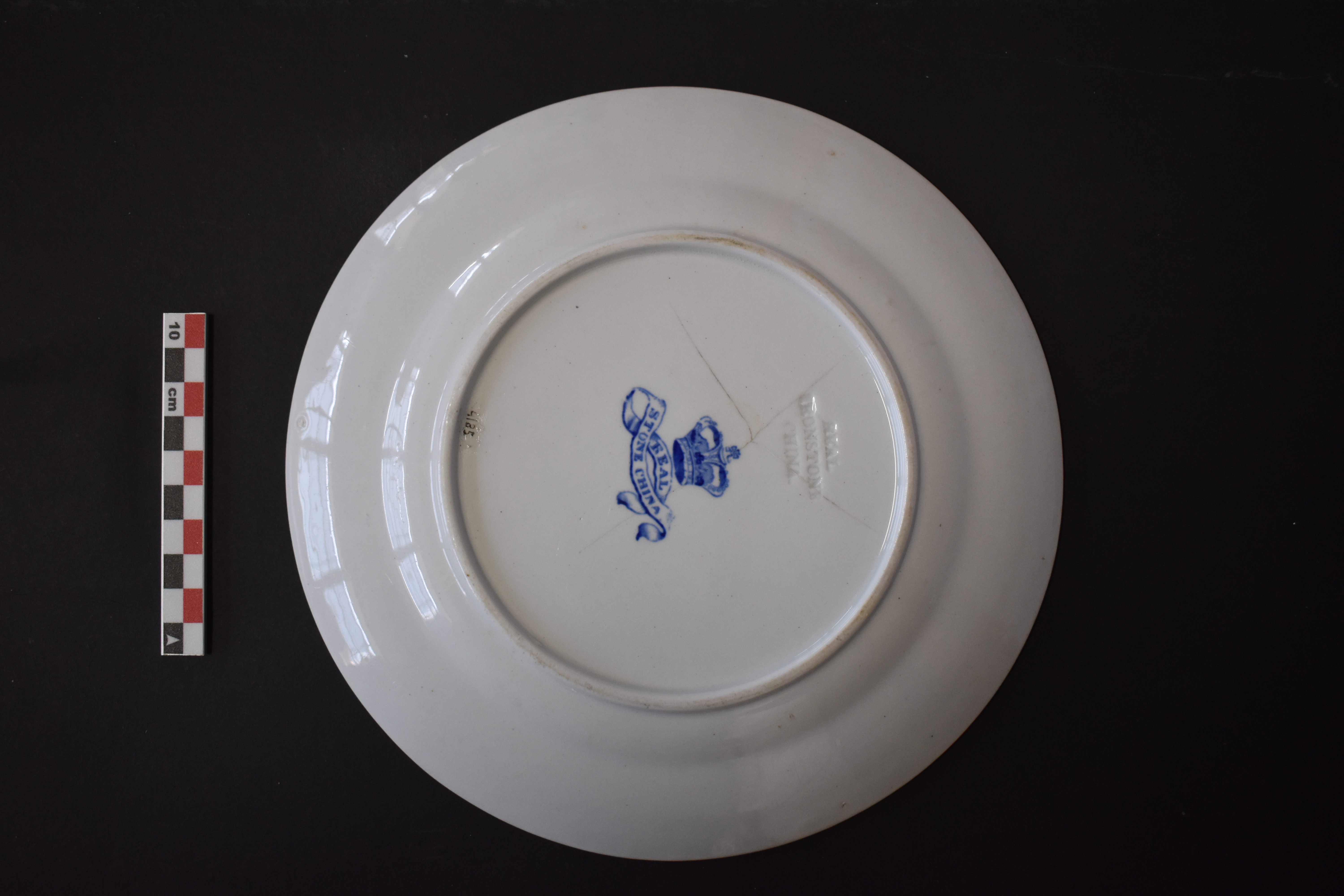 Recipiente de loza blanca tipo ironstone china. Corresponde a un plato bajo con bordes elevados separados del fondo con una abrupta elevación. En cara posterior, en la base, presenta sello bajo relieve "REAL IRONSTONE CHINA" y aplicado por transferencia en color azul "REAL STONE CHINA" adornado con una corona". Loza color blanco con sello en azul.
