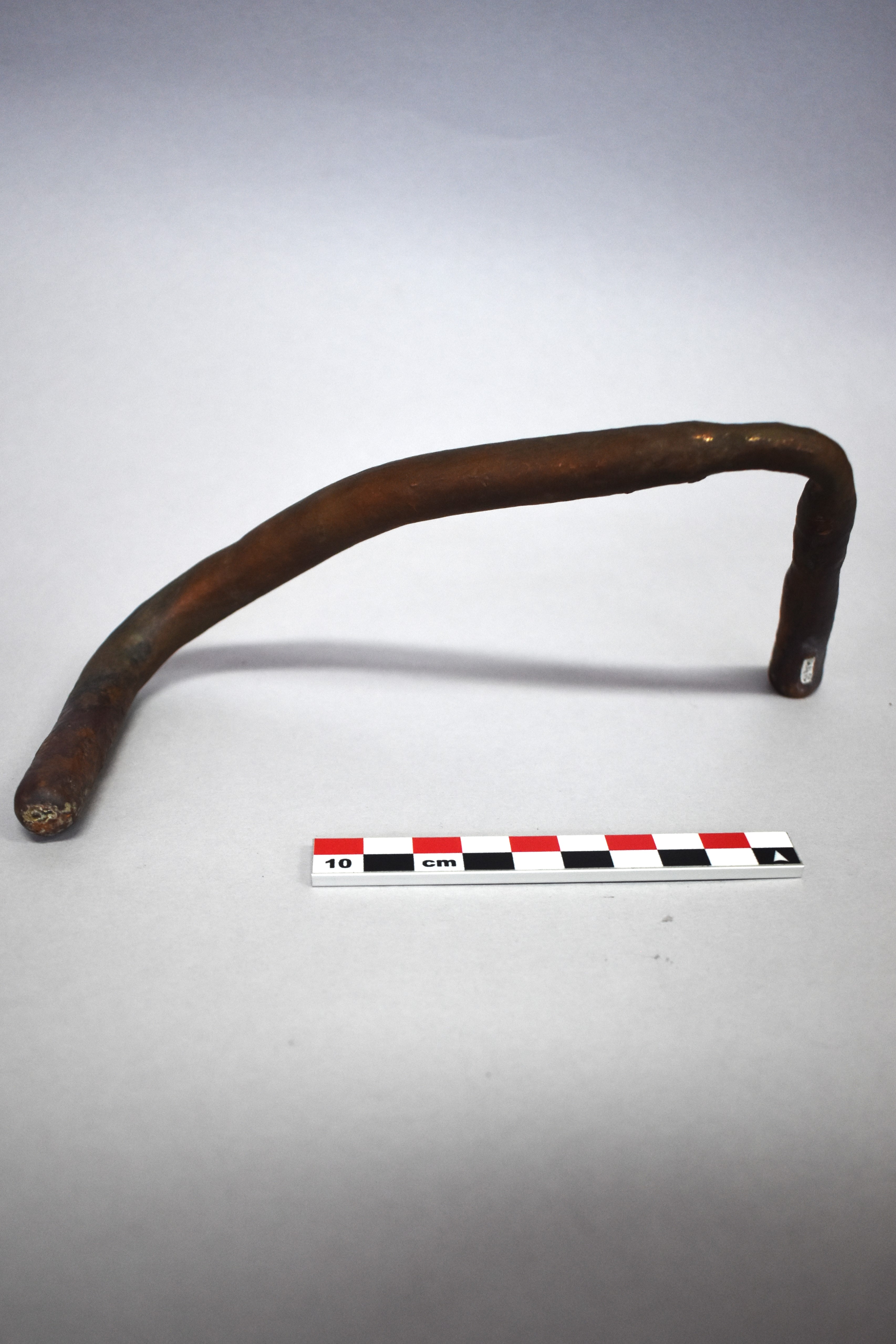 Objeto metálico correspondiente a una vara cilíndrica de cobre con dos curvaturas dando forma de "S". Pieza presenta un espesor menor en la curvatura de uno de los dos extremos. Objeto color marrón cobrizo con tonalidades negras por desgaste
