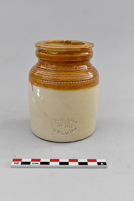 Contenedor cerámico. Objeto de forma cilíndrica con base plana. Presenta perfil simple con hombros marcados que llevan a una boca estilizada y más amplia que el cuello. En la boca presenta acanaladuras de sujeción para una posible tapa a juego. Objeto cerámico vidriado de color blanco y marrón. Presenta sello "Powell Bristol RegMar18 1849" "N°1811", bajo relieve.