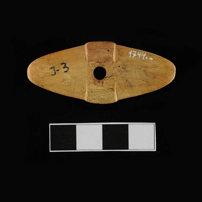 Objeto de forma ovalada, los bordes son romos y presenta una perforación en el centro. En el sector medio tiene una parte rectangular adornada con inciso en rombos y espigas. Color marfil, superficie lisa y pulida.