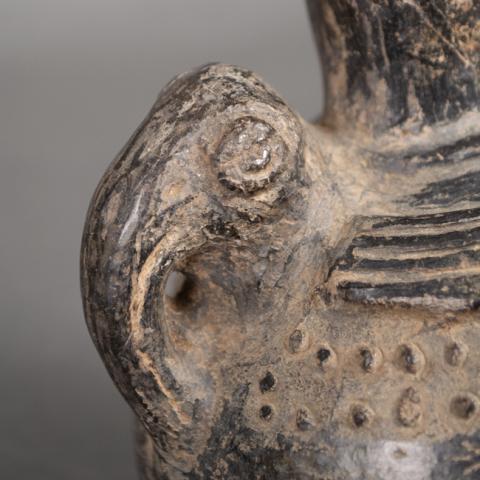 Contenedor restringido de perfil compuesto. Tiene labio redondeado, cuello cónico, doble asa lateral y cuerpo globular de base circular plana. Se encuentra decorado con figuras zoomorfas modeladas que representan un ave en la unión cuello-asas. Presenta decoración sustractiva geométrica en sección globular posterior al cuello. La superficie alisada, pulida y bruñida de color negro brillante.