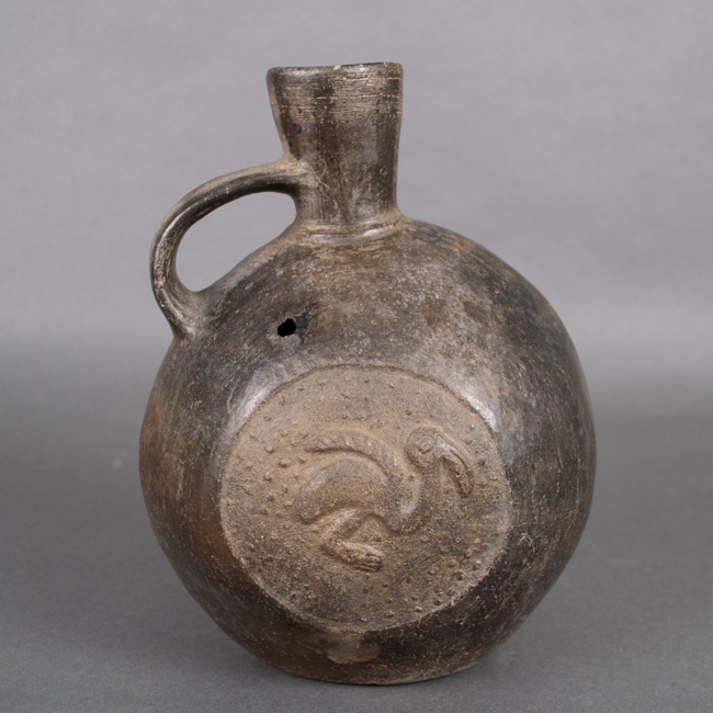 Contenedor restringido, cuerpo globular, base plana circular, cuello cónico invertido, labio redondeado, y asa lateral desde el cuello al cuerpo. En la parte frontal del cuerpo tiene un ornamento circular en bajo relieve con representación de figura zoomorfa. El color es marrón y la superficie pulida.