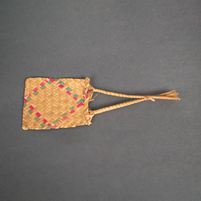 Instrumento de mano rígido utilizado para agitar el aire. Posee un mango compuesto por dos listones de fibra recta envuelta en fibras vegetales tejidas y trenzadas de color vegetal natural y una sección plana de forma cuadrada tejida en trama y urdimbre que presenta una figura romboidal con integraciones cromáticas verdes y violeta. Presenta zonas de pigmentación amarillas.