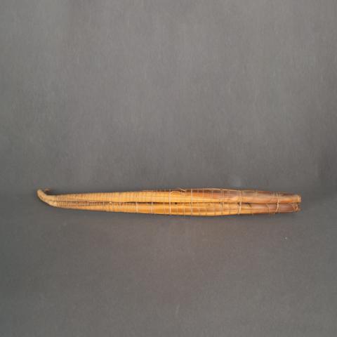 Objeto que representa una embarcación, hecha de fibra vegetal. Está compuesta de dos rollos de totora atados entre ellos con fibra blanca, los cuales se juntan en ambos extremos de la balsa, presentando una una de sus extensiones en punta y curvada. Color marrón claro.