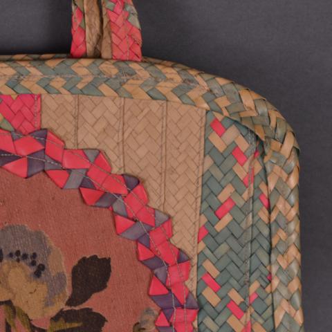 Contenedor flexible de uso doméstico. Tiene forma rectangular con bordes redondeados, y cuenta con dos asas en la parte superior. Está elaborado de fibra vegetal trenzada y cada una de sus cara presenta un medallón textil con motivos florales en el interior. Colores celeste, rosa, y color natural de la fibra.