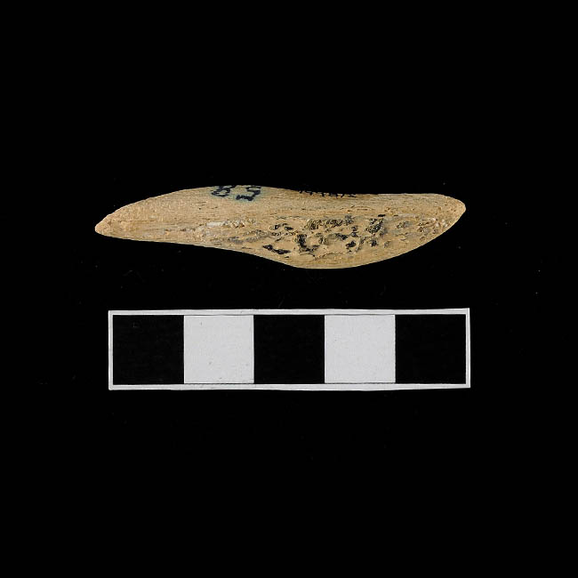 Objeto de forma alargada de cuerpo sinuoso, posee ambos extremos aguzados y pequeñas muescas de inserción. Color beige, superficie lisa.