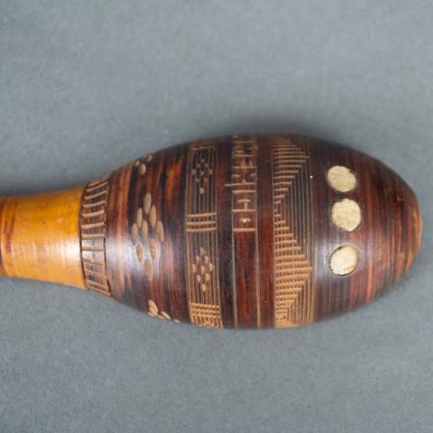 Herramienta de uso culinario. Está compuesta por un cuenco ovalado y un mango. Elaborado en madera, tiene decoraciones geométricas incisas en el lado convexo del cuenco que se observan en contraste con el color marrón de la capa superficial en esta sección. Posee además tres incrustaciones circulares de nácar.