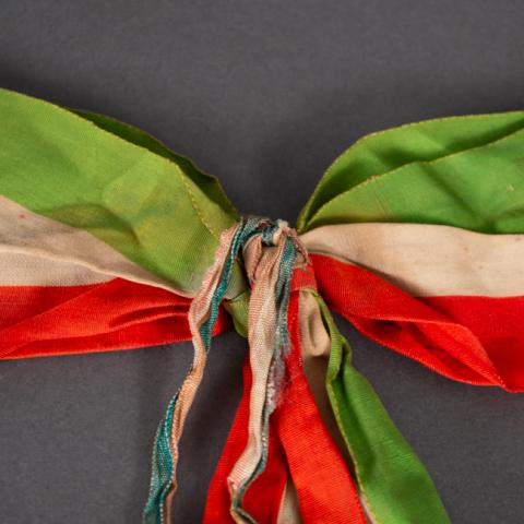 La donante Virginia Bravo Letelier (1908-1992) fue una profesora chilena, militante del Partido Comunista que debió exiliarse en México por causa de la Ley por la Defensa Permanente de la Democracia impulsada por el presidente Gabriel González Videla en 1948 a 1951. De lo anterior se infiere que la pieza textil correspondería a un moño (lazo) de la bandera de México.