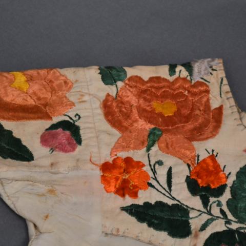 Prenda de vestir de uso femenino que se usa en la parte superior del cuerpo y cubre hombros y borde de cuello. Es de forma recta reforzada en tela color blanco con bordados de flores y hojas de color verde, naranja, rosa, lila, amarillo y blanco.