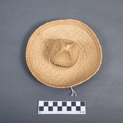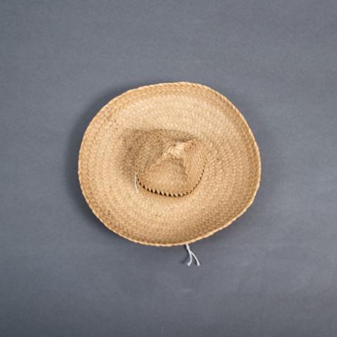 Objeto decorativo que representa un accesorio textil de uso personal compuesto por copa y ala, la cual se curva hacia arriba. Está tejido en fibra vegetal de color natural desde la copa hacia la ala.