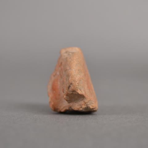 Objeto que representa un rostro con rasgos esquematizados. Tiene forma semicircular, elaborado en greda con terminación de engobe y pigmento anaranjado.