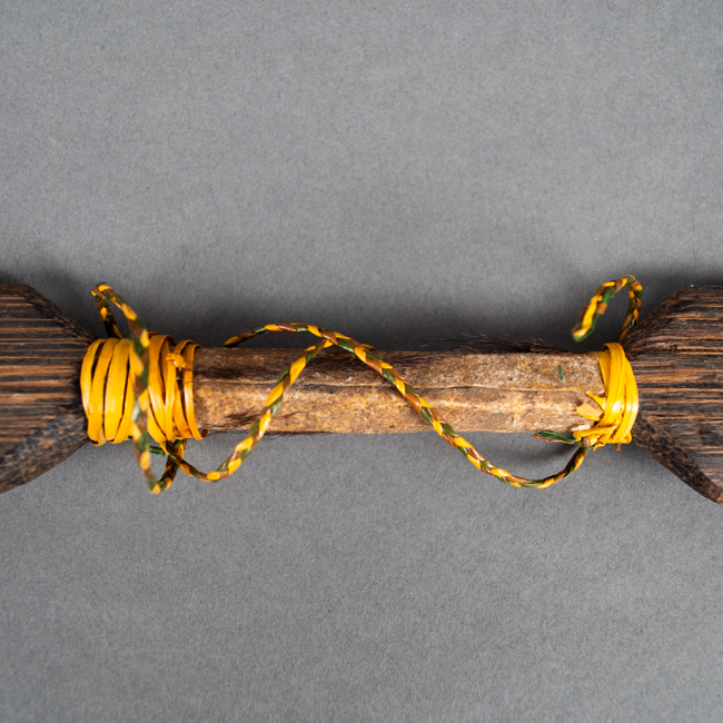 Arma de forma alargada con extremo proximal y distal afilados y ambos con borde biselado. El mango se encuentra al centro de la pieza y está forrado con cuero animal y fibra vegetal de color verde y amarillo. El cuerpo está hecho de madera de chonta.