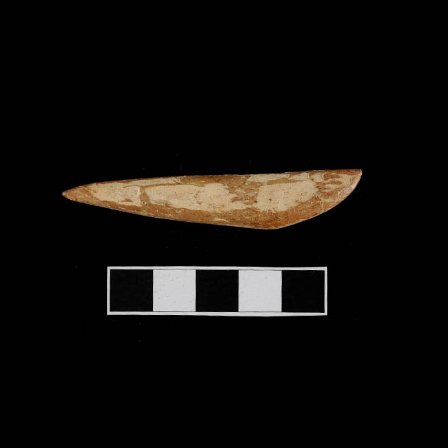 Objeto de forma alargada , posee ambos extremos aguzados y una parte central más ancha.. Color beige con manchas marrón, superficie lisa.