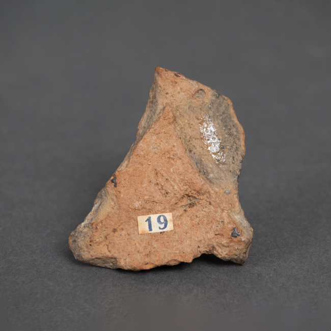 Objeto que representa un rostro de rasgos esquematizados con tocado con figuras geométricas sobre la cabeza. Es de color marrón y negro y tiene reverso cóncavo.