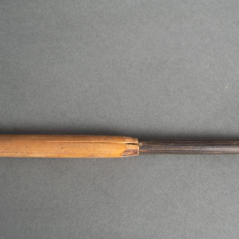Proyectil para defensa o caza elaborado en madera de bambú. En el extremo proximal tiene terminación irregular y en el extremo distal presenta una punta de madera de chonta inserta con embarrilado de fibra vegetal. Sobre el embarrilado se observa una pasta orgánica de color negro.