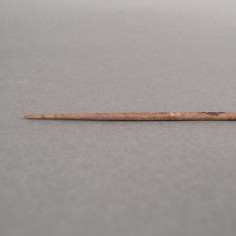 Proyectil de forma cilíndrica, se presente levemente curvado. Tiene los extremos aguzados. Está elaborado en madera tallada con una terminación pulida.