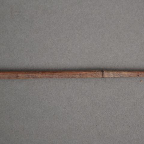 Proyectil de forma cilíndrica con los extremos aguzados. Tiene huellas de decorados de color negro hacia los extremos. Elaborado en madera con terminación pulida.