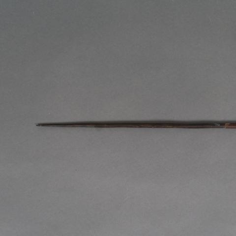 Proyectil para defensa o caza elaborado en madera. En el extremo distal tiene una punta de madera tallada inserta. Tiene decorados incisos con motivos geométricos en el cuerpo de la pieza que se observan en contraste con el soporte por el uso de pigmento negro.