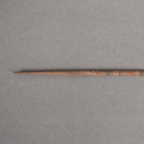 Proyectil cilíndrico, levemente curvado con los extremos aguzados. Tiene decorados geométricos en color blanco, negro y rojo en el centro de la pieza. Elaborado en madera tallada de color natural y terminación pulida en capa superficial.