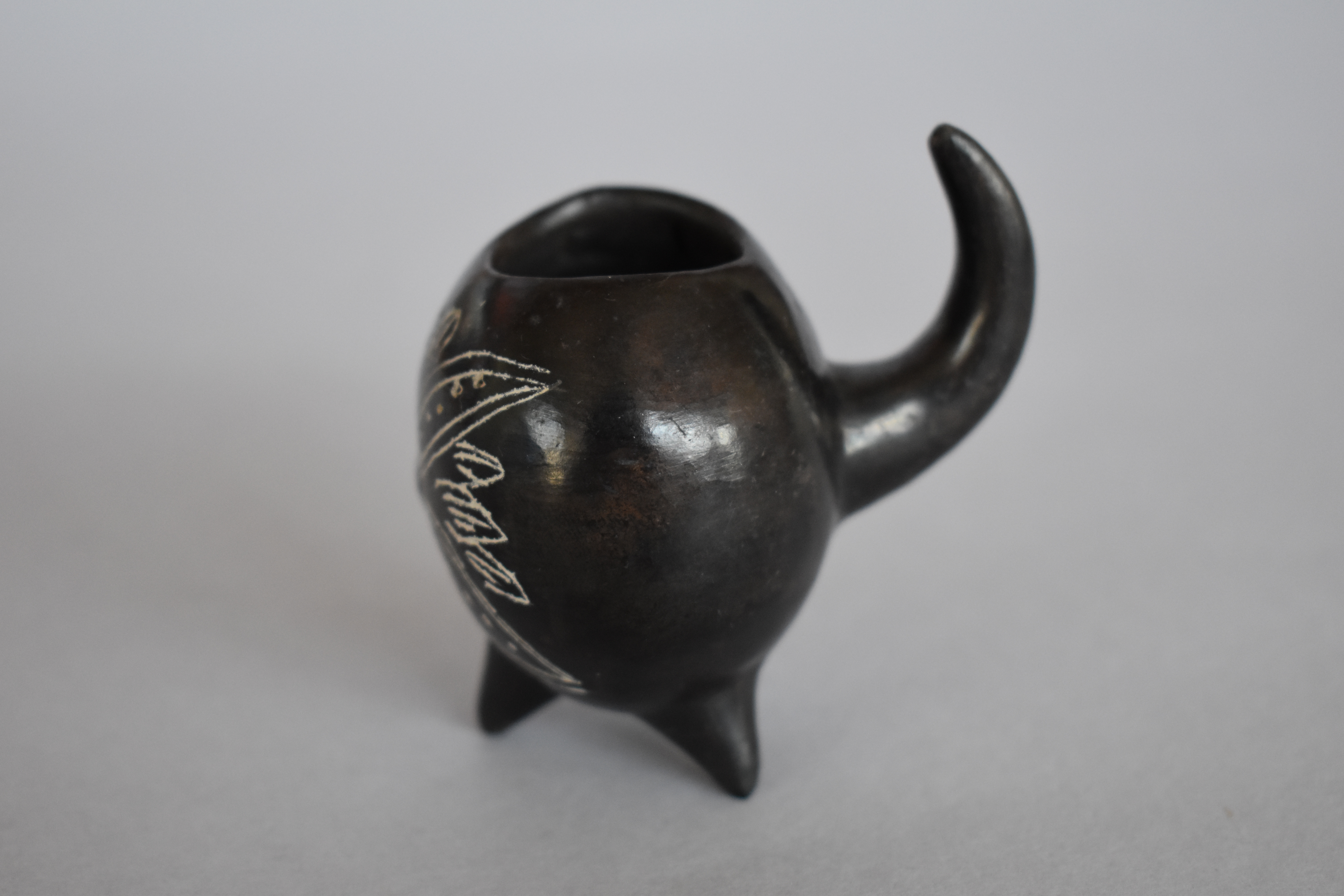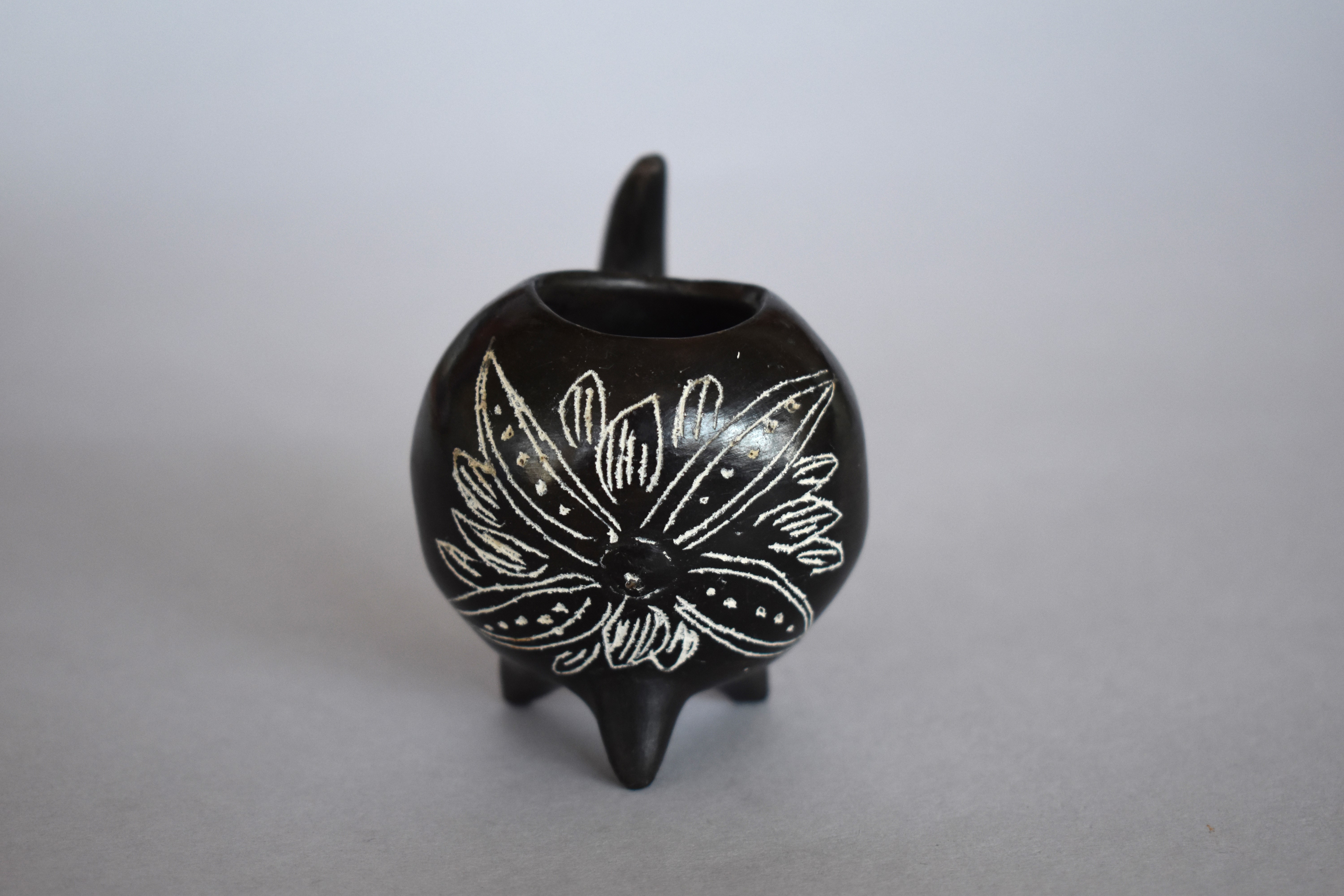 Objeto decorativo. Recipiente de greda de superficie bruñida, engobada color negro en el exterior, compuesto de un cuerpo globular ovalado de borde curvo, que se posa sobre una base de tres patas cónicas. Desde la zona posterior central sale una asa vertical y curva. Se encuentra decorado en el frente con grupos de incisos curvos con incisos lineales y puntiformes encerrados en su interior, presenta también una protuberancia modelada en la zona central de estos, encerrada por un círculo inciso, representando una flor en color blanco.