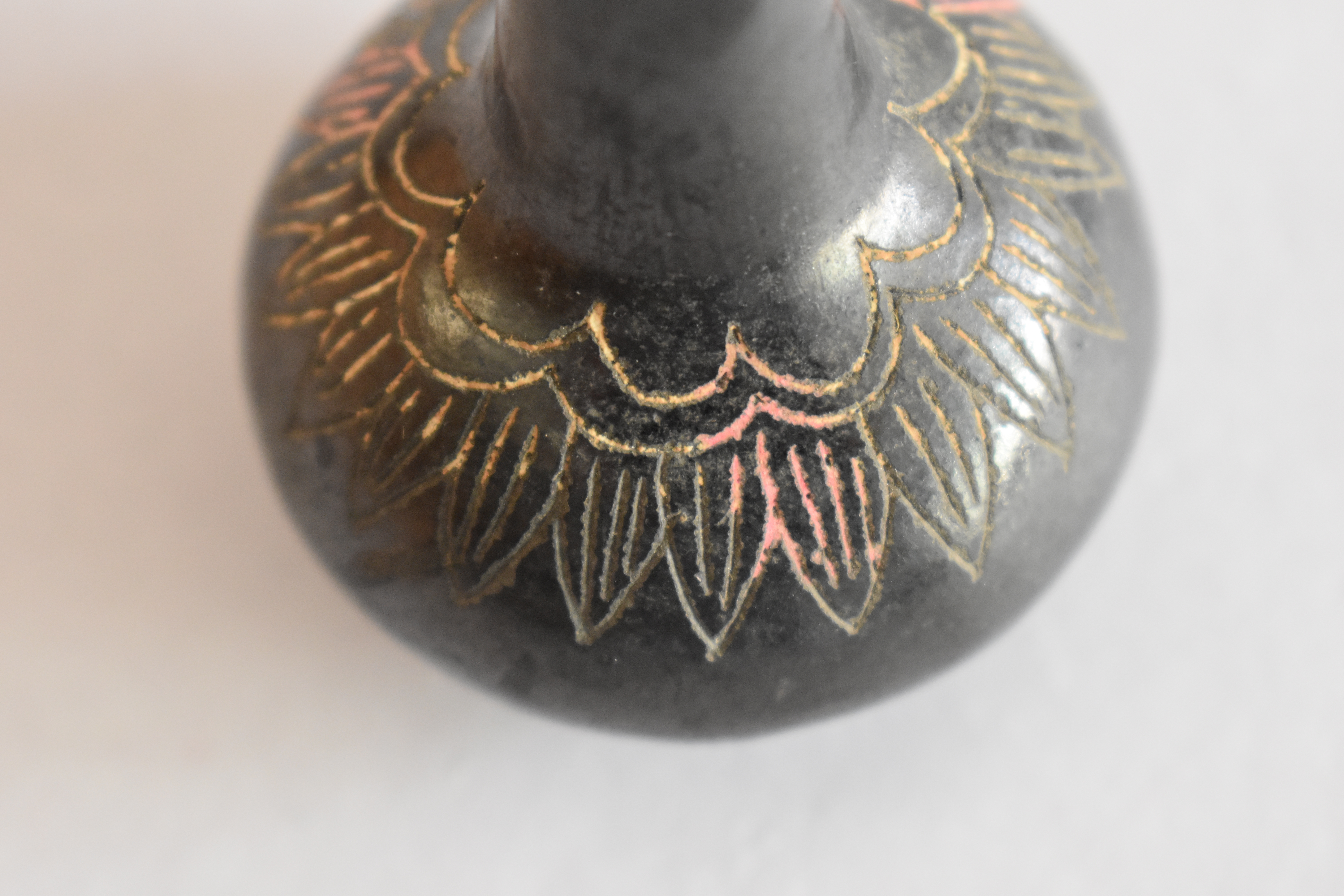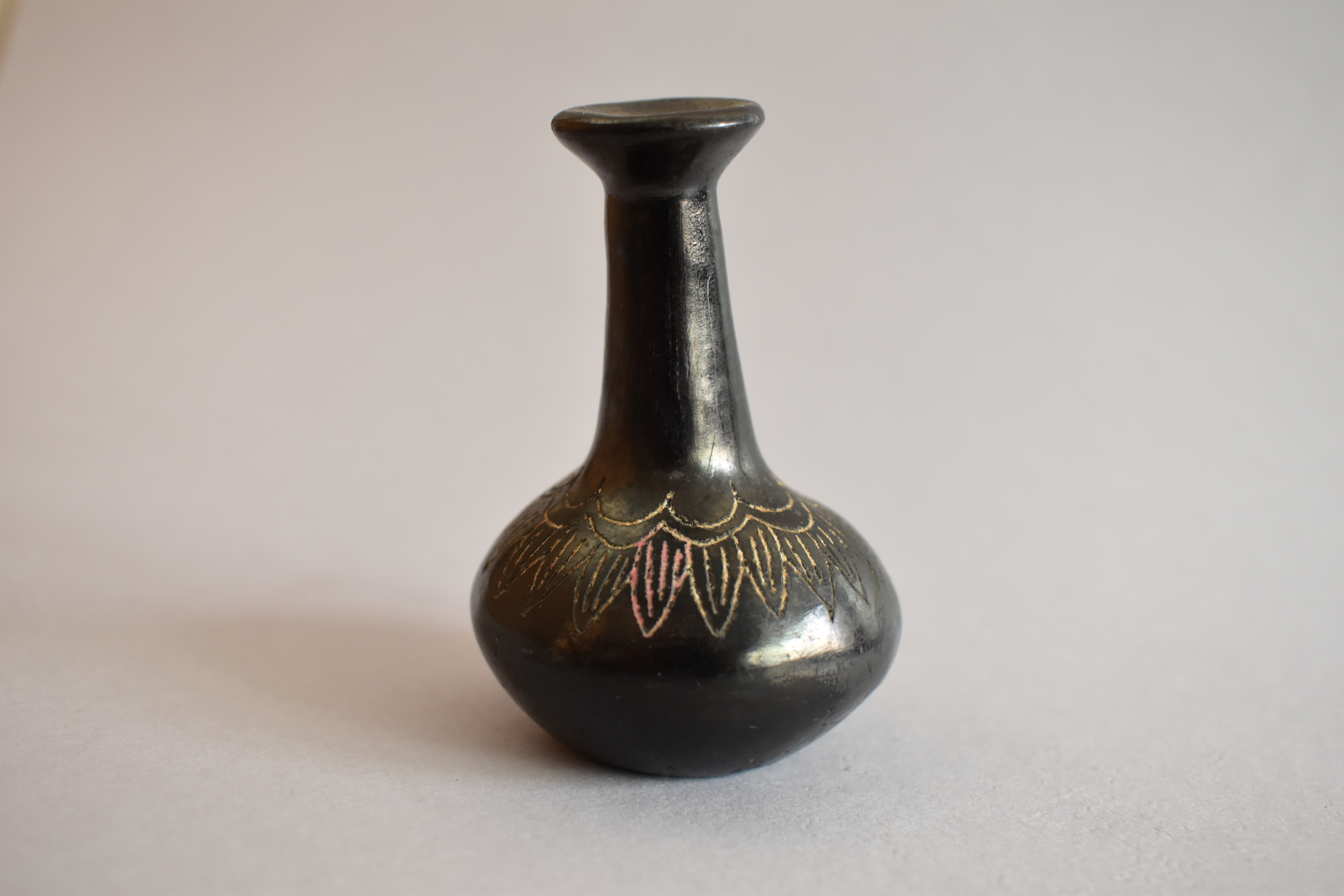 Objeto decorativo. Figura de greda de color marrón oscuro pulido, compuesto por un cuerpo globular con base circular plana, de cuello largo cilíndrico, con labio abierto formando una base plana circular, con un orificio al centro. Se encuentra decorado en la parte superior del cuerpo con incisos lineales y curvos, formando un diseño fitomorfo en color blanco.