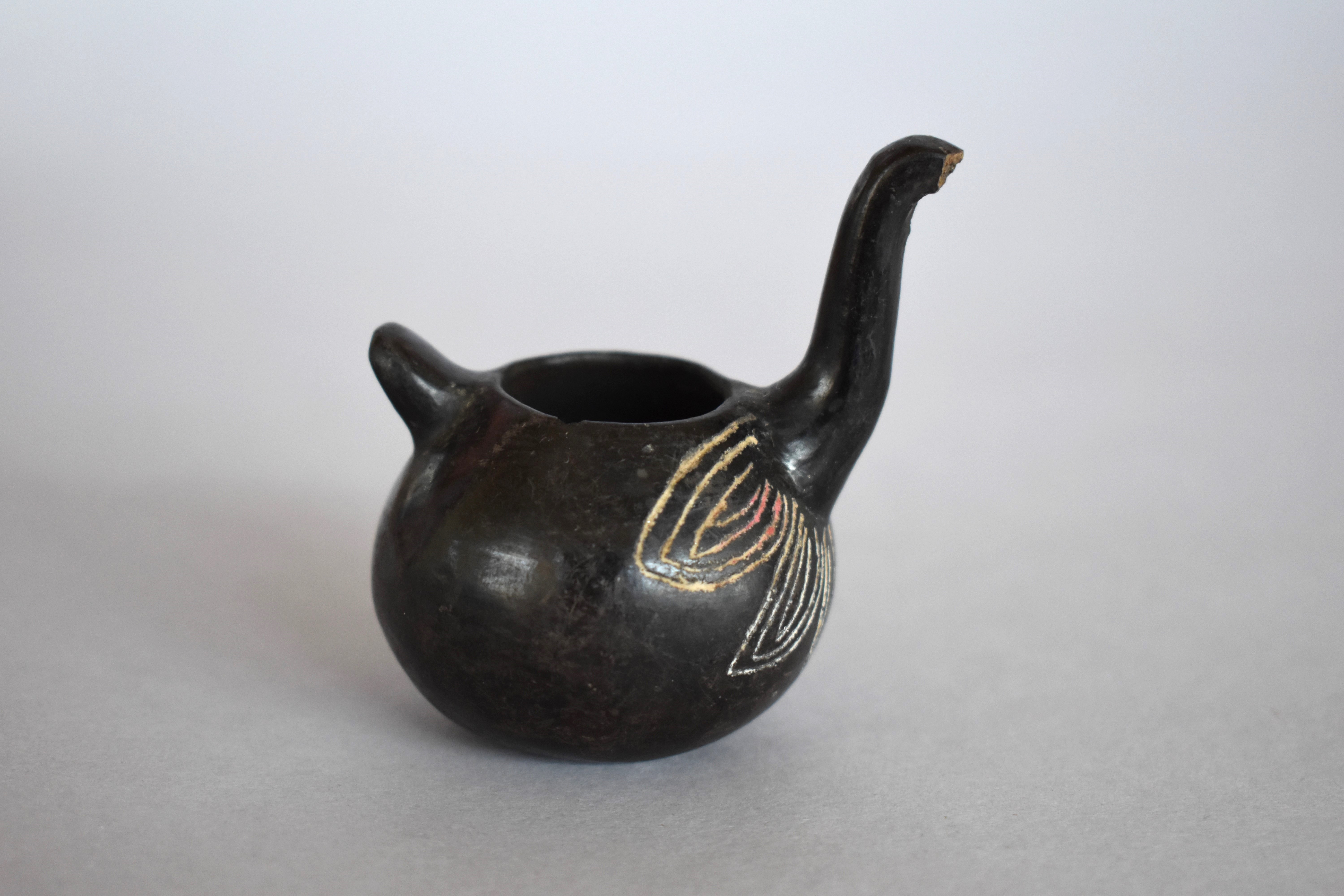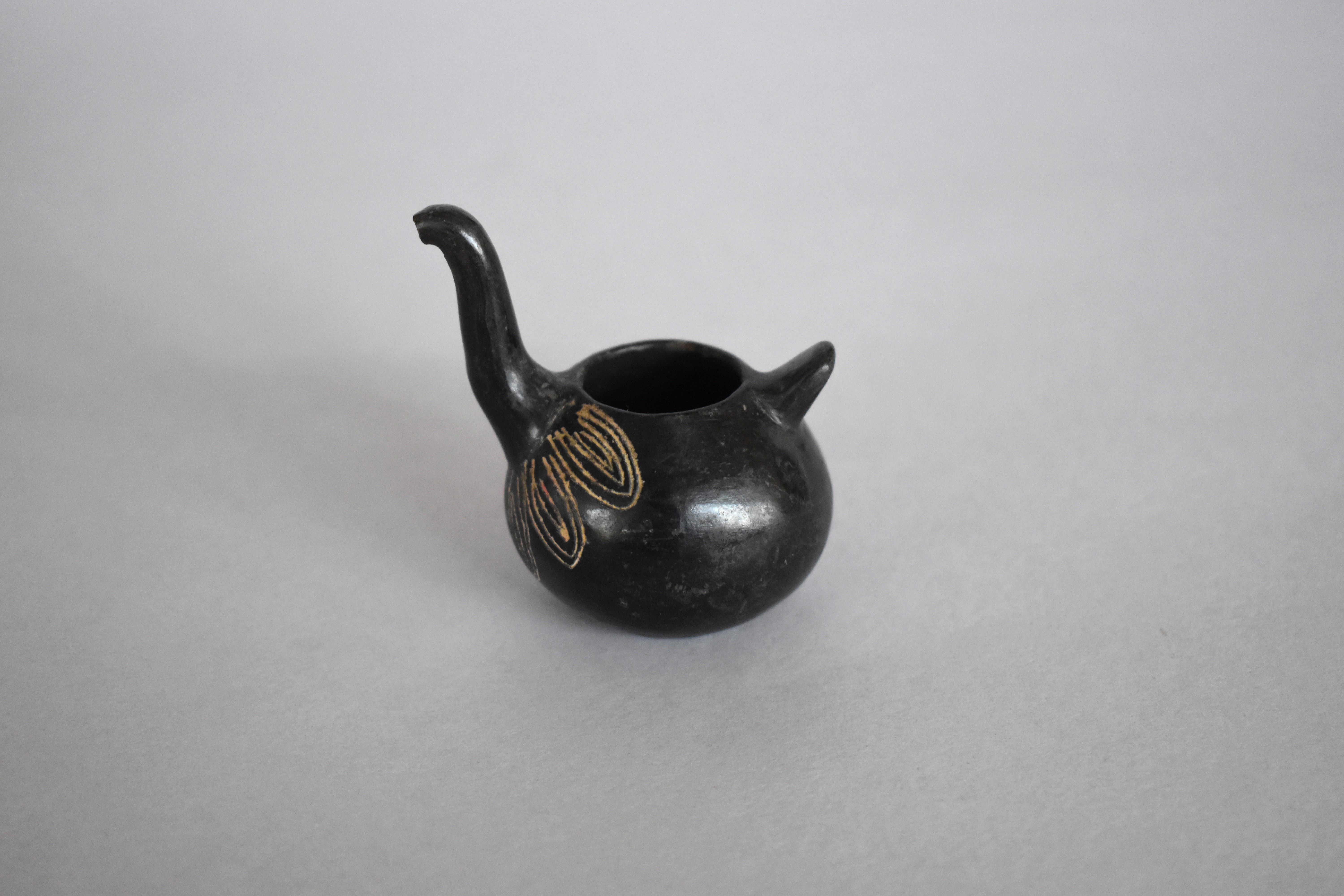 Objeto decorativo. Recipiente de greda de superficie bruñida, engobada color negro, compuesto por un cuerpo globular de borde curvo con base circular plana. Posee un asa corta y ancha que sale desde la zona central del borde posterior. En la porción central frontal del cuerpo posee un surtidor o pico elevado y curvo. Se encuentra decorado en la zona frontal con incisos curvos encerrados en más incisos curvos, formando un diseño fitomorfo en color blanco.